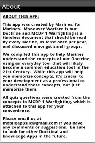 This app helps you make efficient use of your spare time via multiple choice quizzes on the material covered in MCDP 1. Also included is the mobile electronic version of the MCDP 1 Warfighting publication.