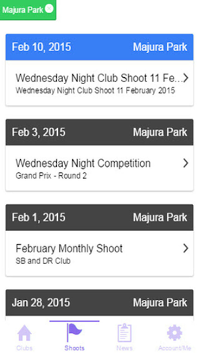 The app allows you to find a club via a location search. Once you have found a club you are interested in you can "Follow" them so they are remembered the next time you use the app or you can select "Shoots" to see past results, future programs and currently in progress shoots.