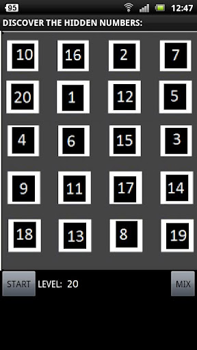 Este juego es un desafío para la mente. Debes recordar las posiciones de los números, primero solo el 1, luego 1 y 2,.... y asi hasta el 20 (7 en version demo!!).