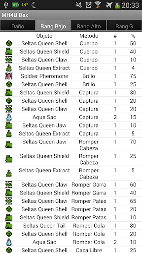 Objetos como rubíes, escamas, bolsas, etc... son indicadas de que monstruo, zona y acción es necesaria para obtener el objeto en cuestión, así como su probabilidad.