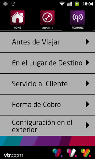 · Roaming: Muestra información detallada sobre el acceso y funcionamiento de los servicios de roaming ofrecidos por VTR, especificando que hacer antes de viajar y en el lugar de destino, así como las tarifas y como llamar a servicio al cliente desde el extranjero.