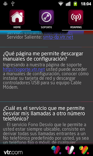 · Soporte: Permite llamar a una línea de soporte VTR, enviar y revisar tweets de @VTRSoporte y acceder a la respuesta de una serie de preguntas frecuentes.