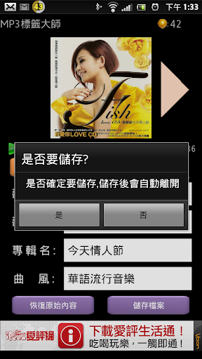 10. 點擊「儲存檔案」將音樂標籤及封面照片存回MP3檔案中並回到歌曲列表。