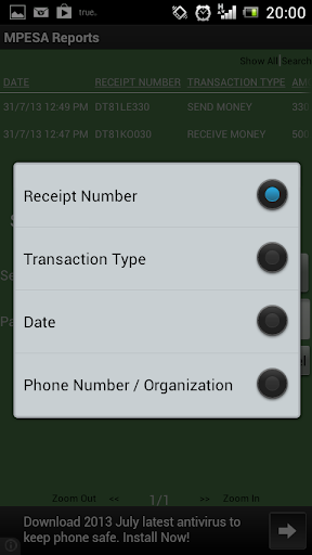 -Ability to search transactions by receipt number/transaction id,names,sender or receiver number and organization name