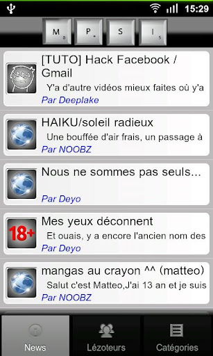 des doses supplémentaires peuvent être administrées, en cliquant sur l'onglet "Lezoteurs": vous trouverez les dix derniers articles de chaque membre de MPSI, (soit plus d'une centaines d'anciens articles). Vous pouvez aussi voir les articles par catégorie.
