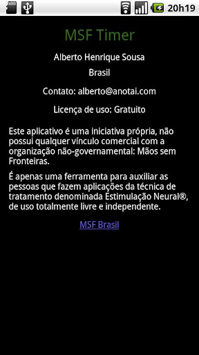 MSF Timer é um aplicativo para auxiliar as pessoas que fazem aplicações da técnica de tratamento denominada: Estimulação Neural ® (Estimulación Neural ®), transmitida pela organização não-governamental Mãos sem Fronteiras (Manos sin Fronteras).