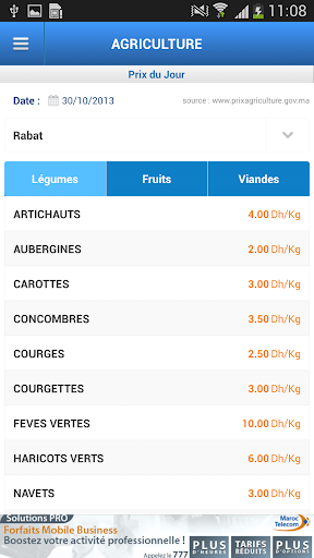 Le bloc d’agriculture comporte en plus des actualités, de l’agenda et des publications, la rubrique de prix qui affiche quotidiennement les prix des fruits, légumes et viandes par régions.
