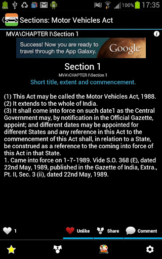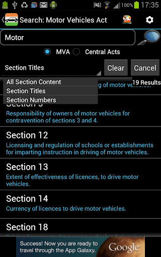 The COMPLETE MVA - Motor Vehicles Act (India) Free Version presented in a readable and searchable format. Divided concisely into Chapters and Sections and containing the full unedited text of all the 222 Sections and Two Schedules*. Everything is Searchable. Scroll through sections by Volume Keys. Current Path is always displayed on the top. This version is AD SUPPORTED.