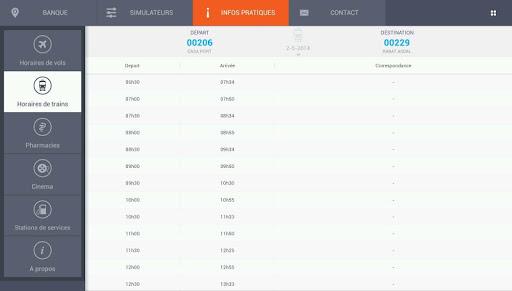• Consultez les horaires des trains, des vols et horaires de cinéma (Mégarama Casablanca et Marrakech)
