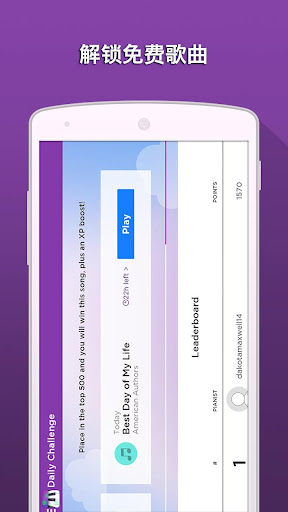 - 通过晋级解锁成就和徽章,赢得免费乐曲并一路攀上乐曲排行榜的顶端。