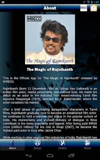 This is the Official App developed by Appytunes Private Limited for a collection of Tamil Hit Songs from Movies showcasing "The Magic of Rajnikanth" released by INRECO.