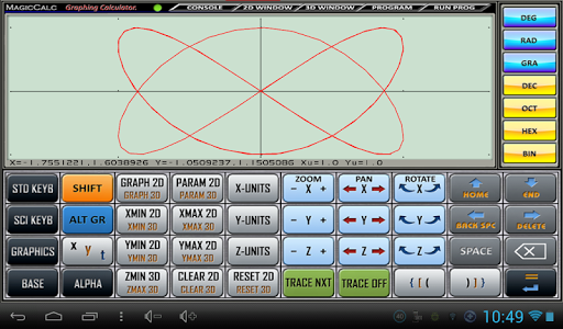 MagicCalc is a full functions full screen scientific and programmable graphing calculator for Phones and Tablets. It's composed by : Console window for input/output, and calculus operations. 2D graphic window for 2D functions and 2D parametric functions. 3D graphic window for 3D functions and 3D parametric functions. Program editor for scripting complex operations. You can save and load your programs.
