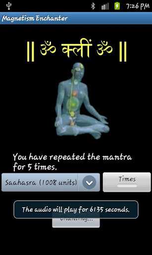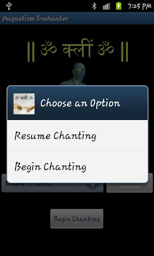 The repetition is traditionally done in a set of 'number presets' that is usually thought to invoke the right amount of energy sustainable by the human mind. The application comes with these preset numbers that can be selected depending on how much time you have to spend during each session. Once you choose a preset number, you can either repeat the mantra that many times, or for those many minutes. Hitting the back button exits the application, but remembers how many times you have repeated the mantra. Each time you start the application you can choose to either resume your last session or start a new counting session altogether. You may reset the counter to zero via the menu option too.