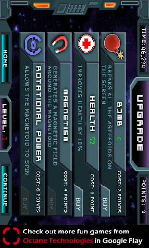 Play addictively as the Magnetoid to save the planet from all hurling objects and alien ships by annihilating them. Earn points by hitting at the weak point of the Asteroid. You can use the points to buy special capabilities like the Rotational Thruster, the Magnetic Field and the Bombs.