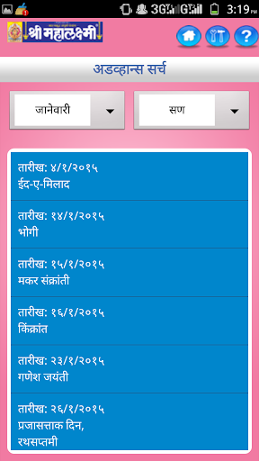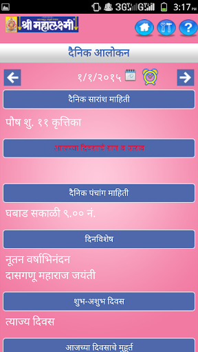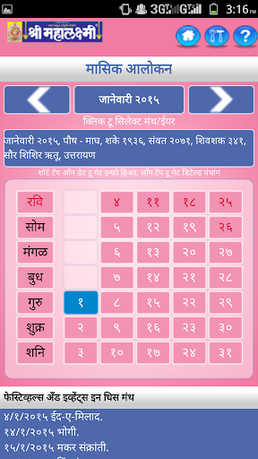 Since 1944 we are publishing Marathi Panchang & Calendar, which became popular by name Shri Mahalaxmi. Shri Mahalaxmi Calendar is published by Saraswati Publishing Company Pvt. Ltd. We are one of the most trusted Panchang Calendar in India. Mahalaxmi Calendar or Almanac is available in Marathi and English. In this professional Marathi version of MAHALAXMI PRO DINDARSHIKA 2015 we have provided details about Purnima, Amavshya, Ekadashi, and Durgashtami information with reminder functionality for each of these, also, detail information on panchang, tithi vishayak mahiti, sankashti, ekadashi, Muhurats, Yatras, Jatras etc are provided.