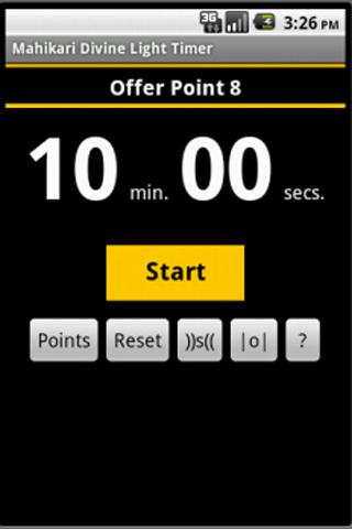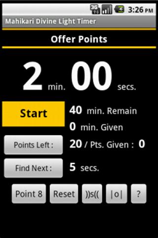 A custom timer for use when offering Divine Light. This app has a 10 minute timer for offering Point 8, and a recurring 2 minute timer for offering Points. When time's up, the timer will alert you with one of 7 gentle sounds of your choice, or it can be set to Vibrate mode or Silent mode. The person offering Light can also set a 1-10 second delay between each Point, thus allowing time to find the next point to offer, before another 2 minute countdown begins. The timer also tallies the total Points Remaining, Points Given, Time Remaining and Total Time Given.