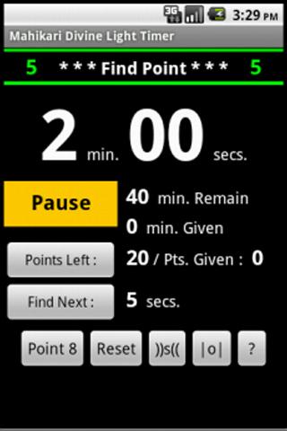 You can easily add or subtract How Many and Find Next settings while the timer is running, or simply press the Pause button and readjust your choices. (Perhaps you need to offer more points than you initially thought; or you've run out of time and need to stop early. Or perhaps you need more or less time to find the next point.) Once the session is finished, press the Reset button to begin a new session.