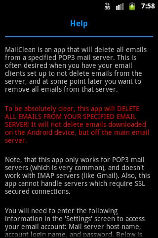 Note, that MailClean only works for POP3 mail servers that do not require an SSL secure connection. It will not work for Gmail accounts (which are IMAP servers). It will work with most POP3 servers such as comcast.net, cox.net, etc.