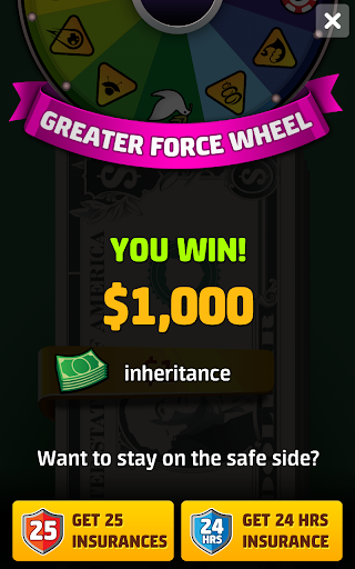 Just like in life, sometimes you’re up and sometimes you’re down! When it’s time to spin the Greater Force Wheel, you can win the lotto or get hit by a tsunami and lose your cash. Don’t want to risk it? Stay on the safe side and protect your assets with insurance!