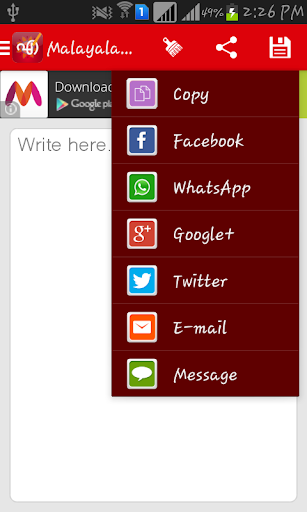 Malayalam Editor is a helpful tool to write in Malayalam and update your status, prepare notes in Malyalam.