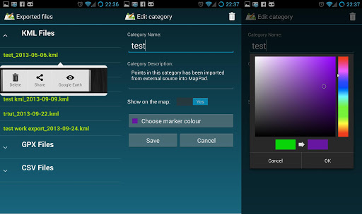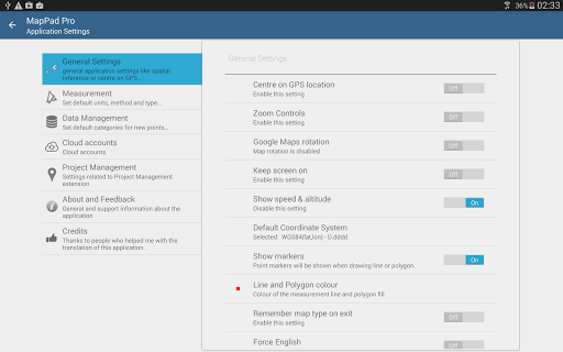 - Ability to set default measurement units, waypoints' categories colours, track recording time and distance interval, transparency of Google Maps overlays and much more...
