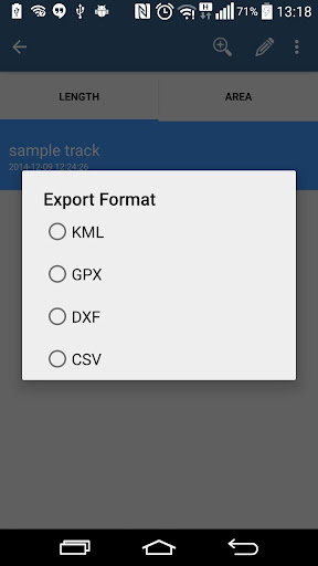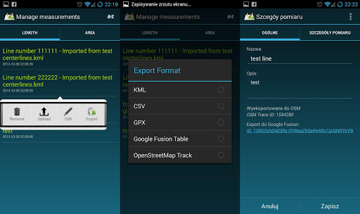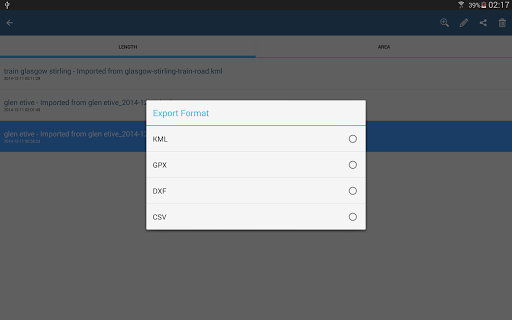 - Export single or multiple measurements or waypoints to KML, GPX, CSV and DXF to SD Card or cloud services like Fusion Tables, Dropbox or Directly to Open Street Map.