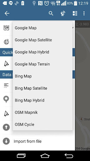- Base maps: Google Maps (Standard, Satellite, Hybrid, Terrain), Open Street Map (Mapnik, Cycle), Bing Maps (Satellite, Hybrid, Roads).