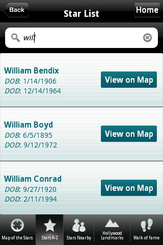The Ultimate Hollywood Celebrity Tour App with close to 3000 different celebrity entries. From Hollywood to Malibu. Homes past and present, every Walk of Fame Stars in all five categories with exact locations. Every celebrity that has ever placed a hand or footprint in cement at the World famous Grauman's Chinese Theater. 16 cemeteries with date of birth, date of death and cause of death of your favorite icon. Each celebrity is linked to a Wikipedia and an IMDb page. over 70 TV and Film Locations, 50 Hotels, many Restaurants and celebrity A-list clubs with hot nightlife ideas. You name it we should have it. Take your own tour and see what you want or use it while on a bus tour to enhance your Hollywood visit. Either way you will enjoy this app. Created by Hollywood insiders and updated weekly. Some celebrity's have multiple homes. Some have multiple stars on the walk of fame in various categories, Motion Picture, TV, Radio, Recording and Live Theater. Gene Autry is the only one with all five and with hand and footprints. Enjoy the app and tell us what we are missing or what you want to see. Thank you.