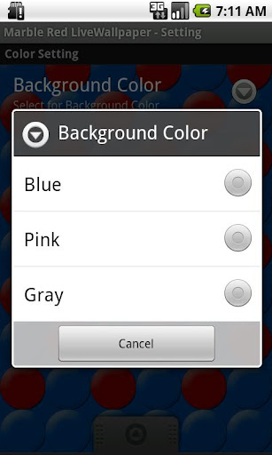 Moreover, a background color and the color of all the marbles can be chosen from 3 colors, "Blue", "Pink", and "Gray", by setup.