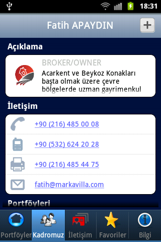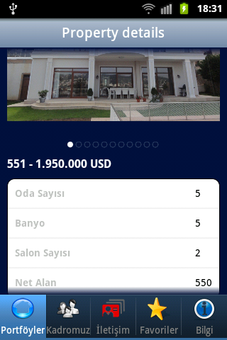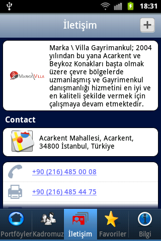 By Marka\Villa application, users can get detailed information about the Marka Villa portfolio. Photos and details of a property are displayed in the application. Users can find detailed information about the brokers and featured properties of the brokers.