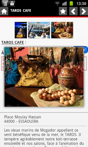 Pour chaque établissement sont proposés un large éventail d'informations incluant une description, des photos, son adresse, son numéro de téléphone, son adresse mail, son site web, une annonce promotionnelle, son emplacement sur la carte ainsi que votre position actuelle et l'itinéraire (carte et description) pour y aller.