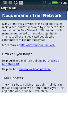 This app was created with non-motorized trail users in mind. Trail descriptions include: distance, elevation change, difficulty, riding ability factors, and suitability for bikes.