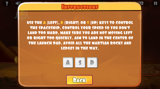 Pilot the Mars Lander back to its home base. Use rocket thrusters to navigate past dangerous rocks and ledges. Land too fast and you'll crash! Best of luck for a smooth and safe landing!