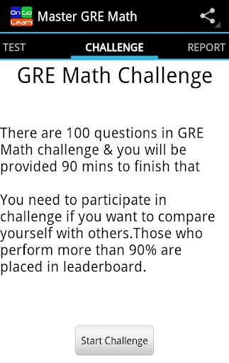 GRE Math Challenge has also 100 questions. Take the challenge after you finish tutorial, practice exercise & practice test. This is basically for comparing your performance with others.
