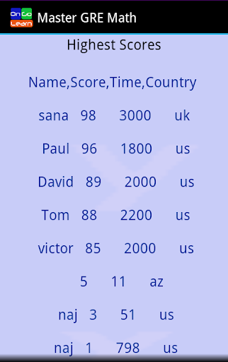 Master GRE Math app will display 50 excellent performers in Global Champion section. You can come to know who else took the challenge and how they performed in compare section even which country they are from.