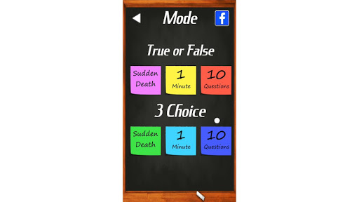 3 Modes Challenges: Sudden Death, 1 Min, 10 Questions.