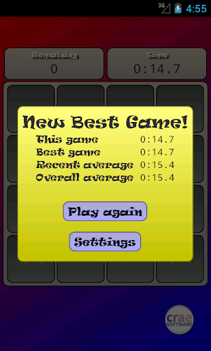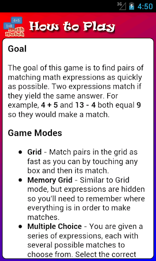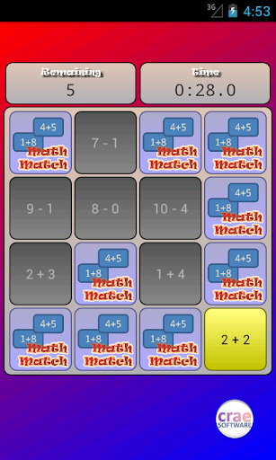 You will be given 6, 8, or 12 pairs of math expressions to match up -- for example, 4+5 and 8+1 match because they both equal 9 -- and the goal is to complete all of them as fast as possible.