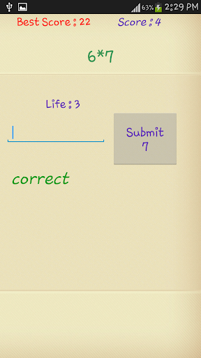 For every correct answer score increases by 2 and for wrong answer the score decreases by 1. Best score is displayed for every level and you can compete with your friend showing how much quick is your math.