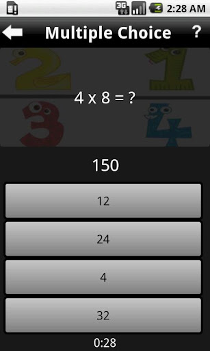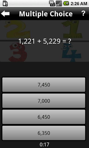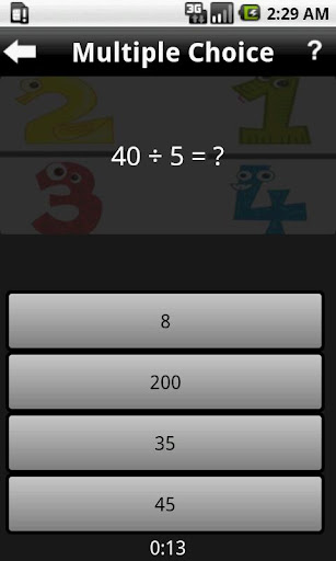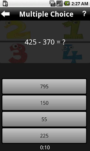 Welcome to Math on the Go: Grade level 3. Using this quiz game your Child/Student will be able to learn the basic math skills that your Child/Student is expected to know in the 3rd grade in a fun interactive way. The game consists of 9 questions that are pulled randomly from the database of over 120 questions. These questions will test their skills in Addition, Subtraction, Multiplication and Division. At the end of the quiz you can review your Child's/Student's score and compare it against others that have used the App.