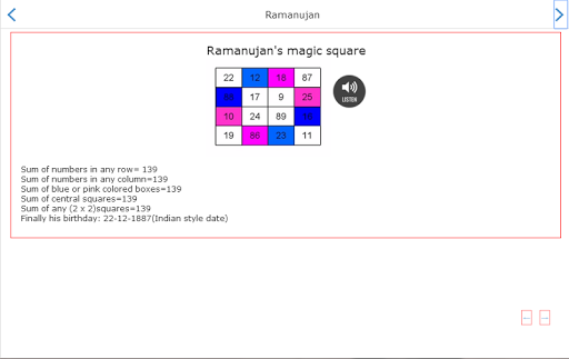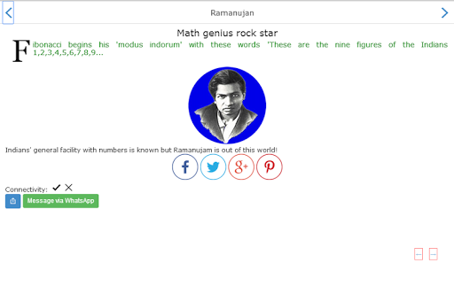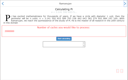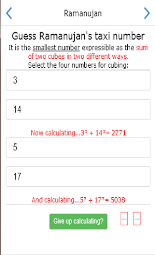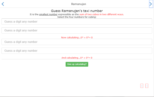 Here in this app we explore the 'taxi number' -try to obtain the smallest number expressible as the sum of two cubes in two different ways-shows his insight and when he was in London; try Pi calculation using web workers-quite intensive if number of cycles increased, for the phone, and go through the 'Top Ten Hit Parade' of his genius.