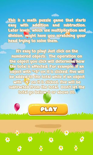It's easy to play! Just click on the numbered objects. The operation on the object you click will determine how the total is affected. For example, if an object with "+5" on it is clicked, five will be added to the total while if an object with "-5" on it is clicked, five will be subtracted from the total. Don't let the total go below 0 or above 20.