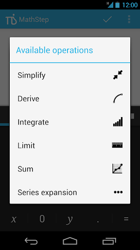 MathStep is a symbolic pocket calculator with a complete CAS (Computer Algebra System) built-in. That means that it can solve math problems for you! It has an expression editor with a live preview and even gives you hints to solving a problem by yourself for some operations. It can even work without an internet connection!