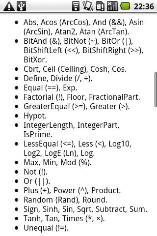 Algebraic entry. Full on-screen history (multi-line display). Use your phone's keyboard or on-screen buttons. Usual functions: trig, log, etc. Parentheses. Copy to clipboard.