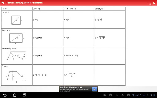 Sicher kennen Sie das Gefühl, vor einer Mathe-Arbeit oder Schularbeit oder sogar einem Test. Sie wissen nicht wie die Formel für den Kreis, das Trapez, usw. ist? Dann ist dieses App genau das richtige für Sie! XXL-Formelsammlung und diverse Rechnungsarten zum Nachschlagen oder für Hilfe im Unterricht! Komplett Gratis und wird jeden Tag geupdated!