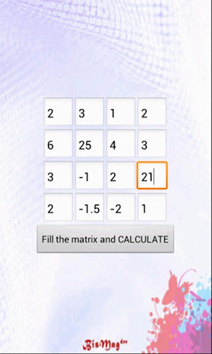 This app allows the calculation of the determinant of any square matrix. The app is simple and intuitive, just size the matrix and insert the values​​, the app will do the rest.
