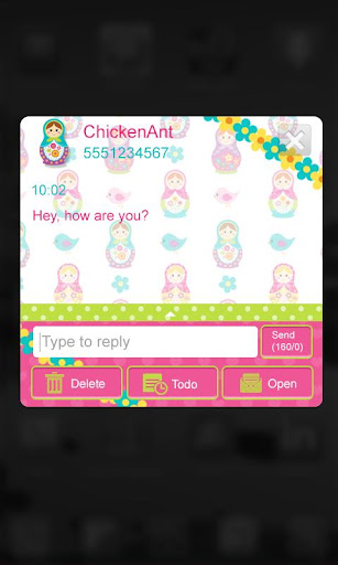 Matryoshka Dolls GO SMS Theme is so sweet! The small pink heart pattern edges the top and bottom of your screen with bright green and white polka dots to accent your inbox and chatbox. The pink russian nesting dolls, flowers and little birds creates a pattern back drop for your inbox and app center, while your chatbox is in full color. Each chat bubble is decorated with a cute, little matryoshka doll!