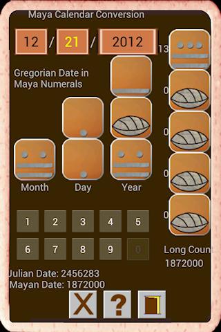 The Maya Calendar and Calculator app allows you to convert a date from the Maya Long Count calendar to the Gregorian calendar, which is what we use today. You can also convert from Maya numbers to the decimal system and from decimal to Maya.