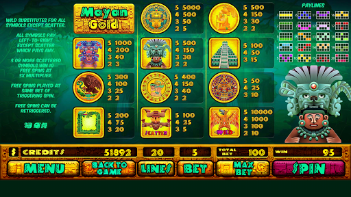 Mayan Gold Slot Machine is excitement of Las Vegas and Mayan history in your pocket, a real gambling experience. Feeling lucky? Hit the jackpot! Choose how many credits and lines you want to bet and click SPIN!