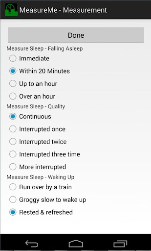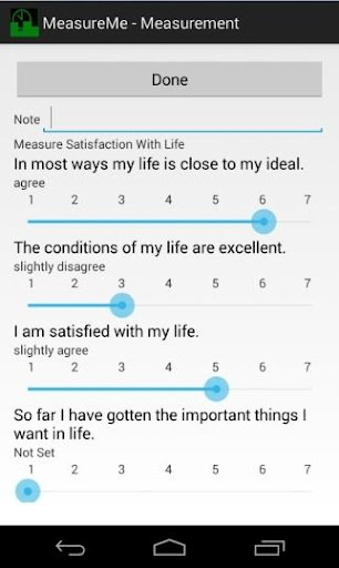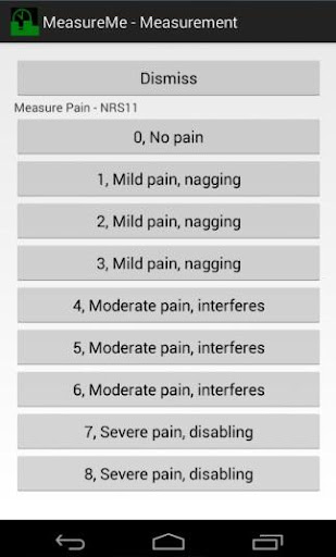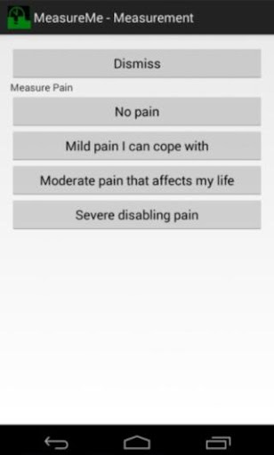 MeasureMe is a low friction personal measurement tool. It can be used to easily create a diary of subjective measurements such as pain, energy and sleep quality. Recorded measurements can be emailed as a csv file for spreadsheet analysis.