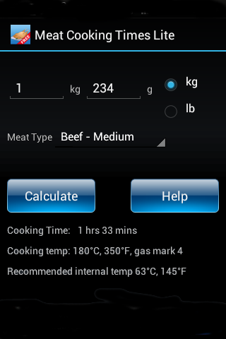 Meat Cooking Times Lite is the free version of a utility app which can be used to calculate the length of time to roast meat in an oven. This version only supports Beef (medium), Chicken and Lamb (medium).